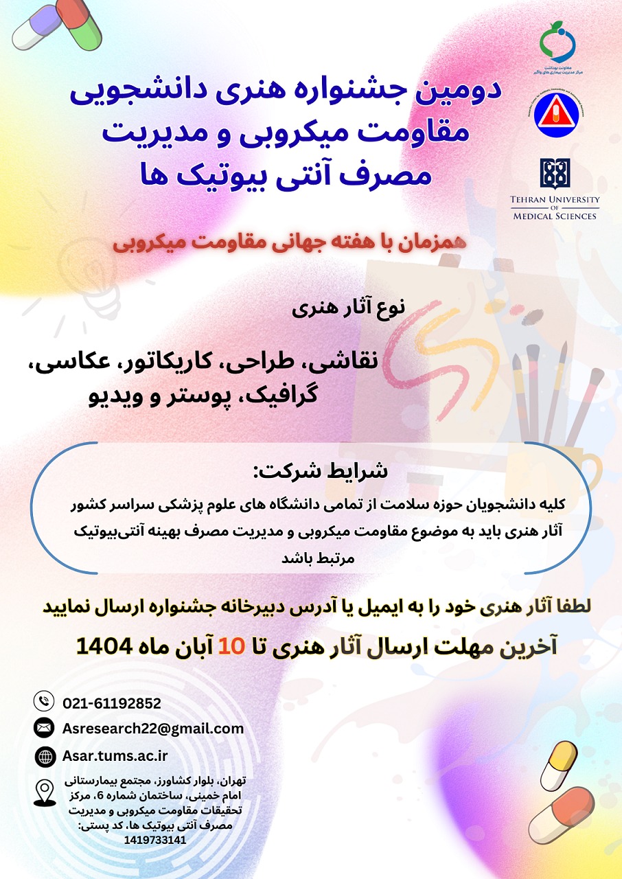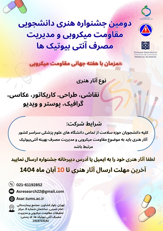 گفتنی است؛ علاقه‌مندان به شرکت در این جشنواره، برای کسب اطلاعات بیشتر می‌توانند به وبسایت مرکز تحقیقات مقاومت میکروبی و مدیریت مصرف آنتی‌بیوتیک‌ها به نشانی https://asar.tums.ac.ir وارد شوند.