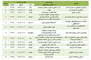 وی ادامه داد: براساس جدول زمانبندی، دوره آموزشی با عنوان « بازاریابی اجتماعی در حوزه سلامت» ویژه کارکنان حوزه بهداشت (طبق فهرست اسامی اعلام شده از سوی معاونت بهداشت) شنبه 4 بهمنماه برگزار میشود. همچنین یکشنبه 5 بهمنماه دورههای آموزشی «پیشگیری از بیماری سل» ویژه بهورزان و «تریاژ در مامایی» ویژه ماماهای شاغل در بیمارستان، دوشنبه 6 بهمنماه دوره آموزشی «مدیریت بیماریابی و درمان بیماری سل» ویژه پزشک، بهداشت خانواده، مبارزه با بیماریها، مربی خدمات بهداشتی، ماما و پرستار شاغل در مراکز بهداشتی، سهشنبه 7 بهمنماه دورههای آموزشی «الزامات و دستورالعملهای تجهیزات آزمایشگاهی» ویژه کارکنان آزمایشگاه تشخیص طبی، «فارماکولوژی در اورژانس پیشبیمارستانی» ویژه فوریتهای پزشکی و چهارشنبه 8 بهمنماه دوره آموزشی «پیشگیری و کنترل بیماری فشار خون» ویژه پزشک، بهداشت خانواده، مبارزه با بیماریها، تغذیه، مربی خدمات بهداشتی، ماما و پرستار شاغل در مراکز بهداشتی برگزار خواهد شد.