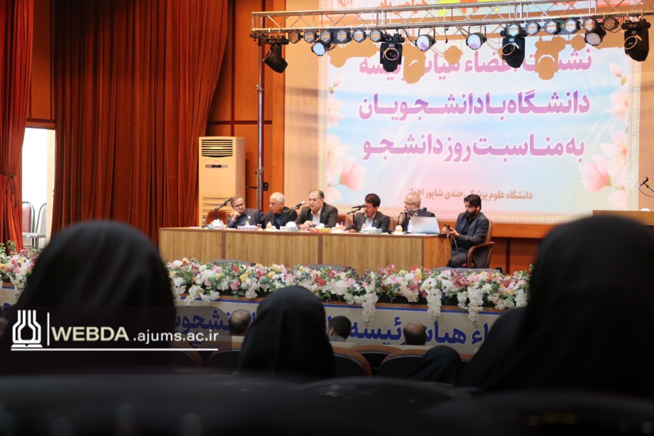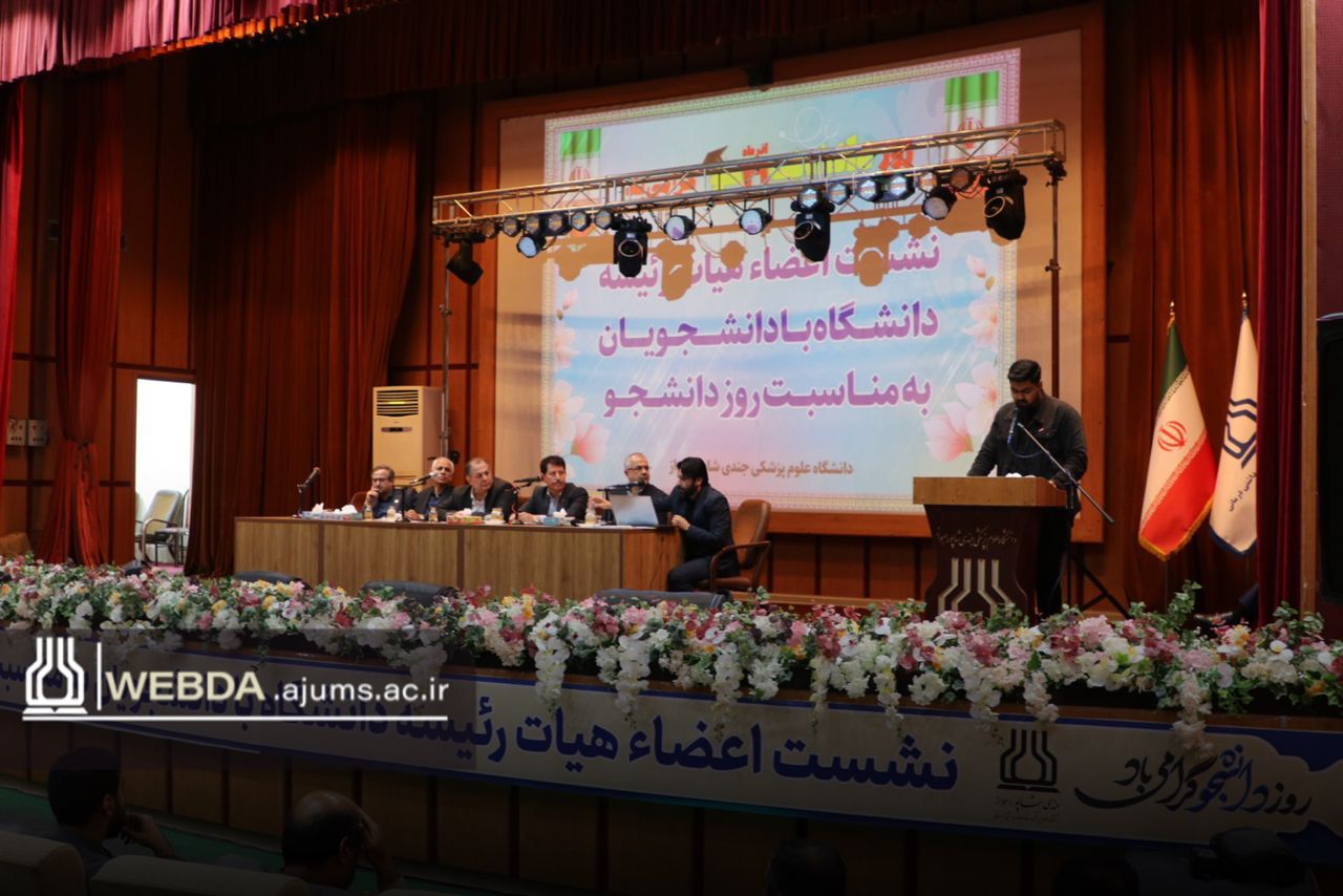 به گزارش وبدا خوزستان، به مناسبت گرامیداشت روز دانشجو، نشست اعضای هیأت رئیسه دانشگاه علوم پزشکی جندی شاپور اهواز با حضور نمایندگان تشکلهای دانشجویی، انجمنهای علمی، کانونهای فرهنگی و هنری، دانشجویان بینالملل، دانشجویان تحصیلات تکمیلی (PhD) و نماینده واحد اقماری بستان، در تالار شهدا برگزار شد.