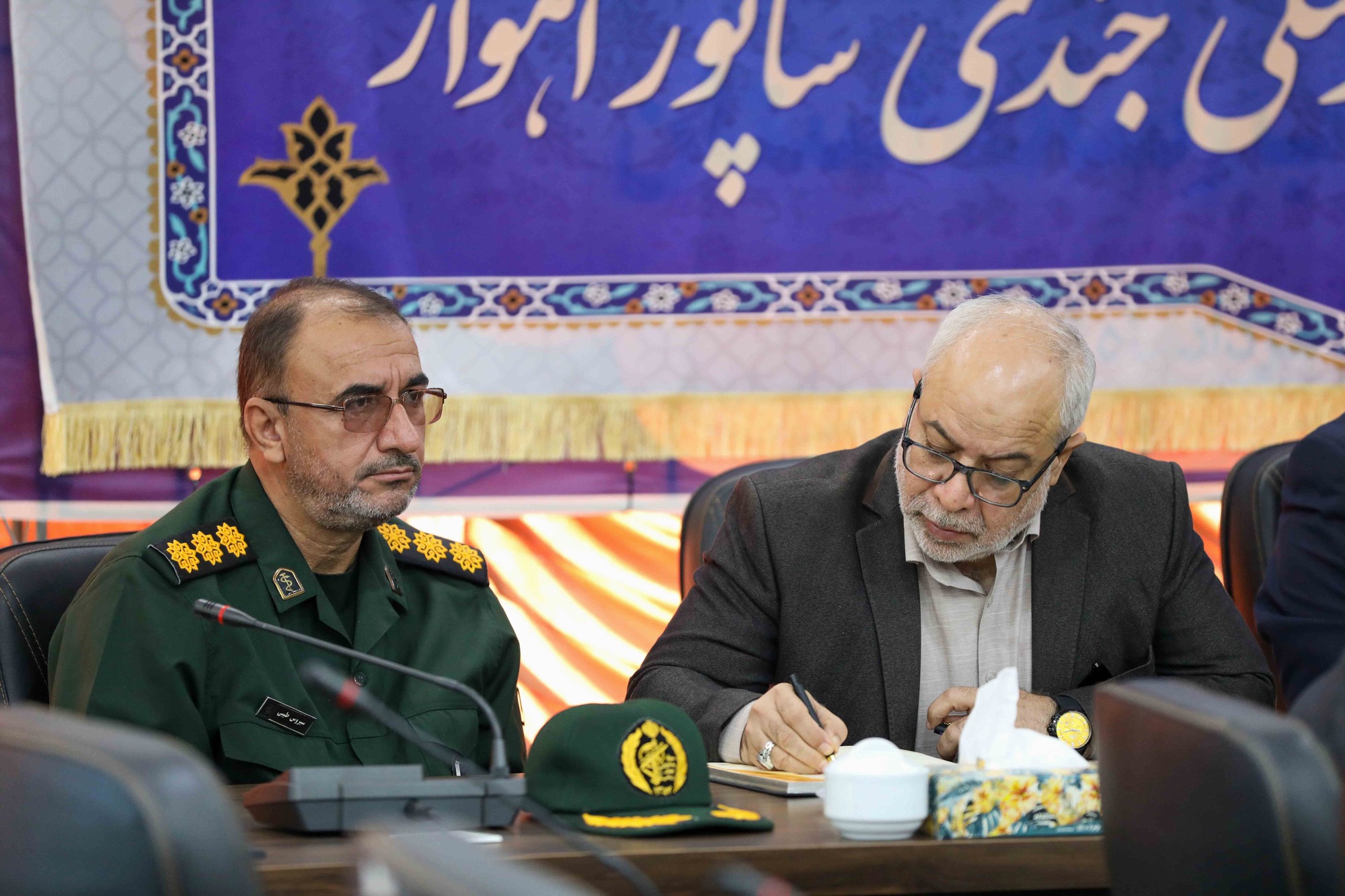 همچنین در این نشست، ضمن قدردانی از تلاشها و فعالیتهای سرهنگ اکبری(دبیر پیشین قرارگاه)، سرهنگ طیبی به عنوان دبیر جدید قرارگاه بهداشت و درمان استان خوزستان معارفه شد.