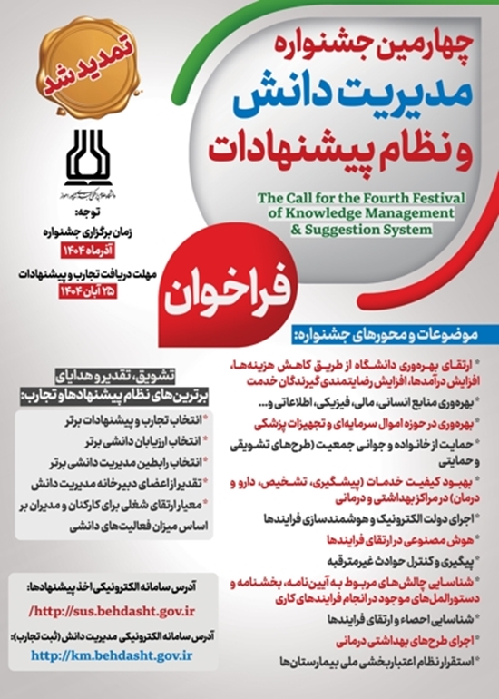 مهلت ارسال تجارب و پیشنهادات تا ۲۵ آبانماه است و علاقهمندان میتوانند پیشنهادات و تجارب خود را از طریق سامانه الکترونیکی نظام پیشنهادات به نشانی https://sus.behdasht.gov.ir و سامانه مدیریت دانش(ثبت تجارب) به نشانی https://km.behdasht.gov.ir ارسال کنند.