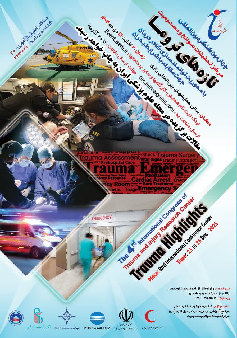 چهارمین کنگره بینالمللی تازههای تروما نیز با هدف ارتقای دانش تخصصی و تبادل تجربیات علمی در حوزه مدیریت تروما و فوریتهای پزشکی و با محوریت توانمندسازی کادر درمان جهت مقابله با شرایط بحران، از ۲ تا ۵ دیماه ۱۴۰۴ توسط مرکز تحقیقات سوانح و مصدومیت برگزار میشود.